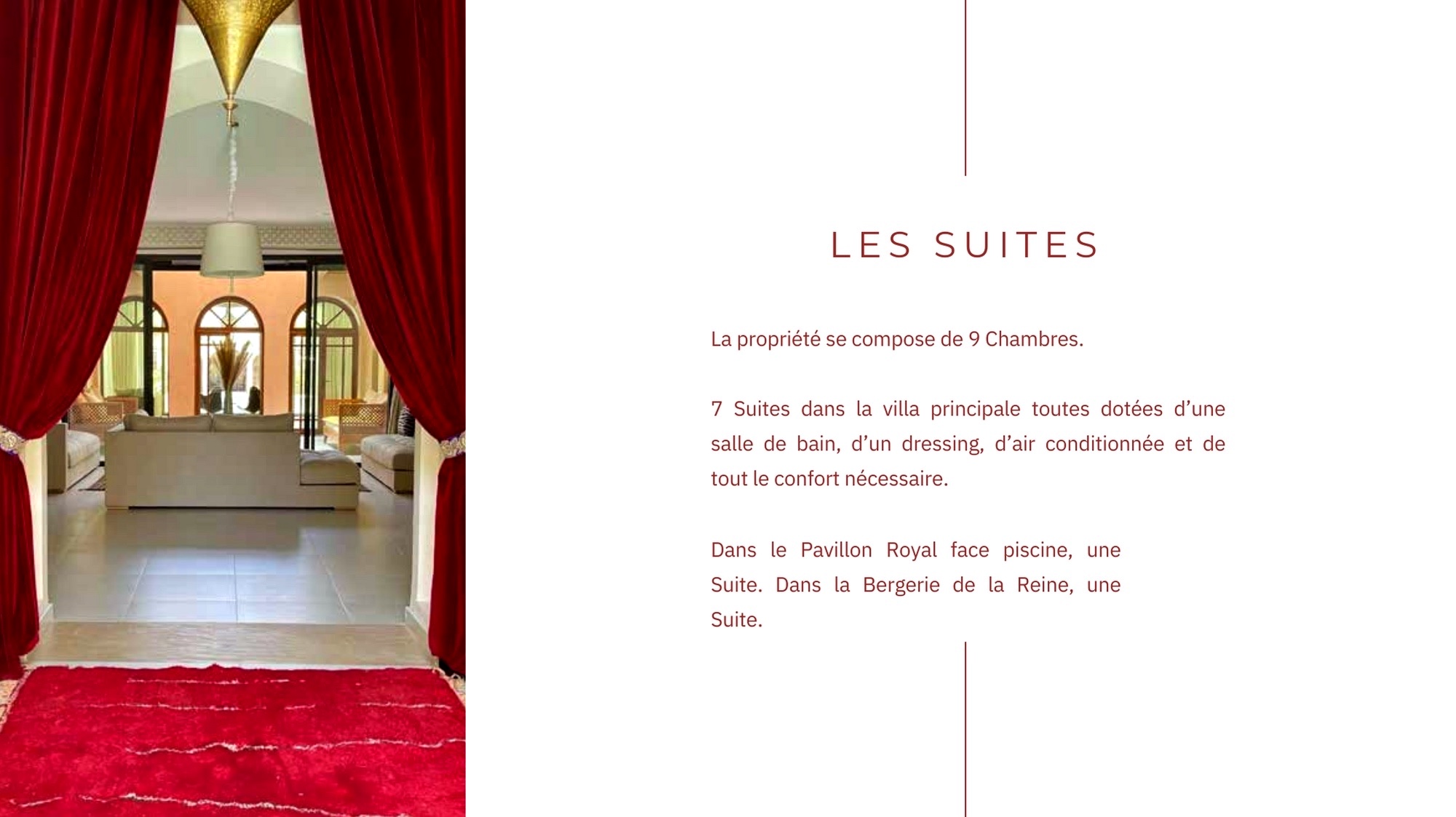 La propriété se compose de 9 chambres , 7 suites dans la villa principale , toutes dotées d'une salle de bain , d'un dressing , d'air conditionné et de tout confort nécessaire et d'une petite chambre de 2 lits de une personne .