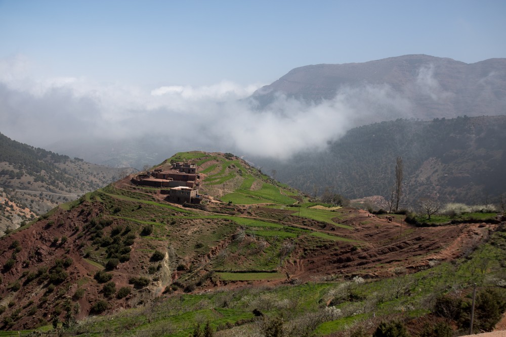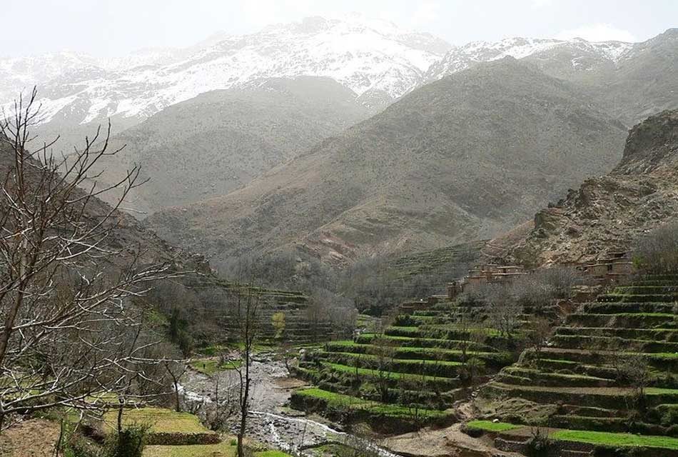 Somewhere during our trip, in the valley, we will take a mint tea break before we carry on our driving to the foothills of the Atlas Moutains. After our break, we will take the off-road leisurely, but if it happens to be a day where it is a Berber Market in one of these villages, we could visit it. Also, we can stop whenever you want to take pictures and we will be able to give you all information you need. People, who live in those villages, suffer from poverty, so we always motivate our clients to bring with them their unwanted clothes, shoes… and they distribute these items once they meet the Berber children on the way. We will continue to ascend until we leave the main road at a height of over 2000meters, then we will follow an old, partly paved Berber route to arrive in Sidi Fares valley, this area is famous withapple’s tree. In a Berber House in a village overlooking the Atlas Mountains, you will have your lunch. The lunch will be homemade and organic (like chicken tagine, couscous, tomato salad and fruits). If you are vegetarian please inform us 24h before, to be conscious of it. After lunch, we will continue our trip to the greener Asni valley, where the orchards lined the way. You can also see the Mount Toubkal: the highest peak in the Northern Africa (4167 meters) and it may be often covered by the snow.