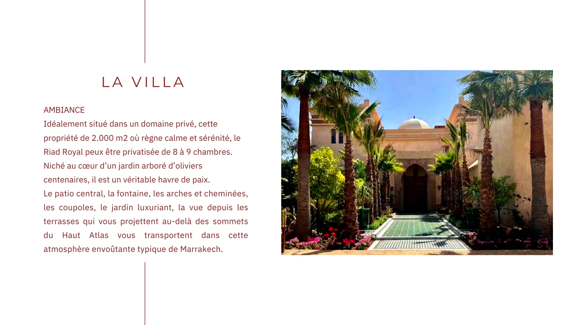 Votre séjour se passera dans un cadre idyllique où vous pourrez retrouver la magie des milles et une nuits de marrakech